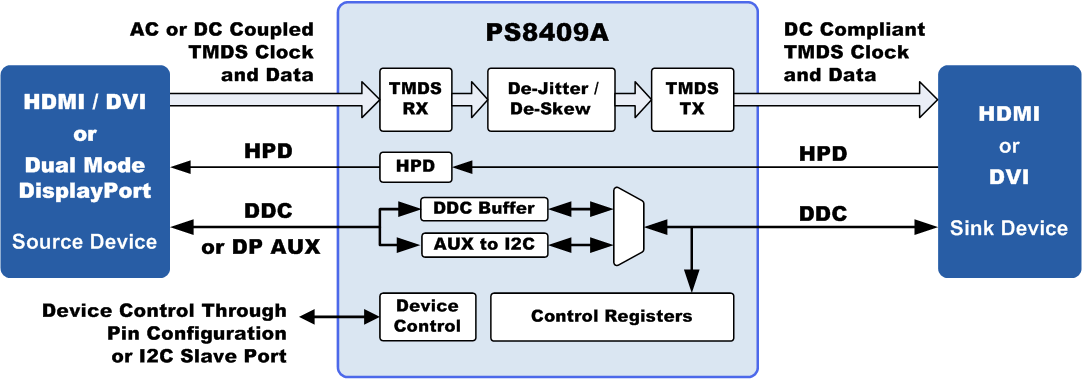 The PS8409A is a HDMI™ repeater, or retimer, that removes jitter and fully supports HDMI 2.0 by supporting up to 6.0Gbps TMDS™ data rate. The device integrates a jitter tolerant TMDS receiver and a jitter cleaning TMDS transmitter for HDMI repeater applications. It removes both the data and clock jitter and the timing skews from the TMDS input to deliver a compliant and very low jitter HDMI output.