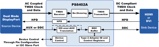 The PS8402A is an HDMI™ level shifter / repeater designed specifically for Type 2 Dual-Mode DisplayPort™ (DP++) cable adaptor applications. It is designed to be used in either a DisplayPort-to-DVI or DisplayPort-to-HDMI Type 2 adaptor. It supports up to 3.0Gbps TMDS™ data rate and integrates a jitter tolerant TMDS receiver and a jitter cleaning TMDS transmitter.