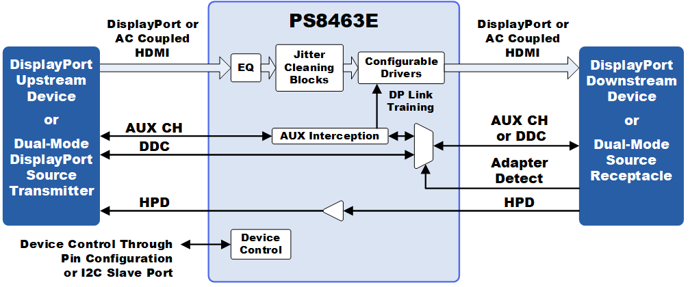 The PS8463E is a Dual-Mode DisplayPort™ retimer that removes signal jitter. It fully supports DisplayPort v1.4a up to the HBR3 link rate and HDMI™ 2.0 up to the 6.0Gbps TMDS™ data rate through the dual-mode function. The device integrates a jitter tolerant DisplayPort and TMDS receiver, and a jitter-cleaning retimer prior to the DisplayPort and TMDS transmitter. It is suitable for DisplayPort, Dual-Mode DisplayPort, and DisplayPort Alt Mode applications. It removes the data and clock timing jitter and the timing skews from the DisplayPort or TMDS input to deliver a compliant and very low jitter DisplayPort or HDMI output. When used for native DisplayPort signaling, through the use transparent repeater operation the PS8463E main link output swing and pre-emphasis levels will response to link training between the DisplayPort video Source and downstream Sink. For LTTPR (Link Training Tunable PHY Repeater) operation, the PS8463E monitors the DisplayPort AUX Channel to snoop the LTTPR DPCD register transactions. When used with a dual-mode upstream Source, the PS8463E supports the Dual-mode AC coupled TMDS signaling that enables the support of DVI or HDMI Sink devices through the use of a downstream level shifting device such as a Dual-mode DP to HDMI adapter. The PS8463E is ideal for Source, Sink and repeater device applications including docking devices. The requirement for “jitter cleaning” using a retimer commonly exists in a video source to remove Tx jitter and/or induced media (transmission path) jitter in order to meet DisplayPort and HDMI output jitter requirements, especially at higher DisplayPort link rates or higher TMDS clock rates. The device can also be used within a DisplayPort docking device or Sink, as a repeater near the input connector, to improve receiver performance margin. Signal integrity can be further optimized through the use of the PS8463E’s programmable input equalization and output pre-emphasis controls. Key Features Compliant to VESA® DisplayPort™ (DP) Standard version 1.4 for 1.62, 2.7, 5.4 and 8.1Gbps link rates Compliant to VESA DisplayPort™ PHY Compliance Test Standard for Source and Sink devices Supports LTTPR command snooping Supports Dual-Mode DP repeater applications: DP link rates up to 8.1Gbps and TMDS rates up to 6Gbps Compliant to HDMI 2.0 specification up to 6.0Gbps Supports intermediate link rates for eDP applications Retimer function provides jitter cleaning for both DP and TMDS CrystalFree™ technology – no external crystal or reference clock is needed Automatic Link Training support – no system level support needed Superior Intra-pair and Inter-pair de-skewing Programmable receiver equalization to compensate for PCB and/or connector losses Link training based automatic equalization adjustment for DiplayPort operation Field proven AUX interception technology for DisplayPort repeating Source initiated power saving management Automatic power down management Built-in AUX CH and DDC combiner for Dual-Mode Source repeating Low power consumption Pin control or optional local I2C control 3.3V and 1.2V power supply 4.5×6.5mm 46-pin QFN RoHS compliant and halogen-free package ESD: HBM 7kV 0° to 85°C and -40° to 85°C operating temperature range options Applications PC Desktop and Notebook Motherboards Notebook Docking Stations Graphics Cards Monitors and Displays Set-top Boxes