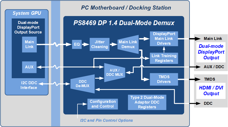 The PS8469 is a 1:2 demultiplexer IC that is connected to the output of a Dual-mode DisplayPort Source device. An internal retimer circuit is used for jitter cleaning both native DisplayPort signaling and the TMDS signaling enabled by Dual-mode operation. Supports DisplayPort 1.4: Link Rates of 8.1Gb/s (HBR3), 5.4Gb/s (HBR2), 2.7Gb/s (HBR), and 1.62Gb/s (RBR) Supports up to 600MHz TMDS clock rate for the TMDS DVI/HDMI output Supports DVI, and HDMI 2.0b (up to 4K@60Hz) TMDS data rate of up to 6.0Gb Includes the Type 2 Dual-mode DisplayPort cable adapter register to simplify Source device driver support When passing the Dual-mode DisplayPort signal from the device’s input to the DisplayPort output, the PS8469 behaves as a transparent DisplayPort jitter cleaning repeater device. When the Dual-mode Source device is outputting a TMDS signal, the AC coupled TMDS signal is jitter-cleaned and converted to a DVI or HDMI compliant signal at the TMDS output through the use of an internal AC to DC level-shifter. The buffered DDC path through the device is connected to an internal I2C register that is configured as a Type 2 Dual-mode DisplayPort cable adapter register, as per the VESA® DisplayPort Dual-Mode Standard. This allows the Dual-mode Source device driver to recognize the support capability of the level shifter function. The Dual-mode DisplayPort output will also support an external level shifter-based DisplayPort-to-HDMI/DVI Dual-mode video adapter (dongle). Jitter cleaning will be applied to both the DisplayPort or TMDS modes. The PS8469 can be configured to use the output hot-plug detect pins to enable automatic mode switching and device power management. An automatic output squelch function disables the outputs when no input signal is present. The PS8469 can be used on the same circuit assembly as the Dual-mode DisplayPort Source device, or can be used remotely such as in a docking station. To ensure the maintenance of optimal signal integrity, the device includes an input equalizer to compensate for PC board, connector, and cable losses. When using the DisplayPort output, the PS8469 includes a transparent output driver function that uses AUX channel interception, or “AUX snooping”, that allows it to respond to output amplitude and pre-emphasos output drive settings indicated by the DPTX to the DPRX during the DisplayPort link training process. This helps to ensure DisplayPort PHY compliance at the system output receptacle as well as to ensure robust interoperability with the display device, regardless of display cable length. APPLICATIONS PC Desktop and Notebook Motherboards Notebook Docking Stations Graphics Cards KEY FEATURES Supports Dual-mode DisplayPort™ (DP) De-multiplexing to a Dual-mode DisplayPort output and a TMDS™ output Jitter-cleaning of both DisplayPort and TMDS using internal retimer circuit Intra-pair and inter-pair de-skewing Crystal Free operation Full HDMI or DVI interface support from the TMDS output Compliant to the VESA DisplayPort 1.4 Standard — supports up to 8.1Gb/s link rate (HBR3) Compliant to the HDMI 2.0b specification — supports up to 6.0Gb/s TMDS output Includes Type 2 Dual-mode adapter register for Source driver discovery Built-in AUX CH and DDC combiner for Dual-Mode Source support Full link training support using DisplayPort transparent repeater function to control DisplayPort output levels Dual-mode DisplayPort operation supported by DisplayPort output Source initiated power saving management Automatic power management Low power consumption Device configuration can be through pin settings or I2C slave input, which offers additional device options Uses 3.3V I/O and 1.2V core power supplies 5x10mm 66-pin QFN package, RoHS compliant and halogen-freeDisplayPort™ V1.4 Dual-Mode Jitter Cleaning Demultiplexer, DP 1.4 and HDMI™ 2.0b capable