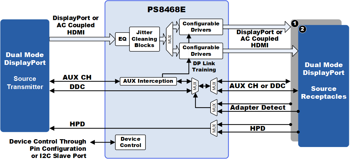 The PS8468E is a Dual-Mode DisplayPort™ retimer with a built-in output demultiplexer. It fully supports DisplayPort v1.4a up to the HBR3 link rate and HDMI™ 2.0 up to the 6.0Gbps TMDS™ data rate through the dual-mode function. The device integrates a jitter tolerant DisplayPort and TMDS receiver, and a jitter-cleaning retimer circuit prior to DisplayPort and TMDS transmitter. It is suitable for DisplayPort, Dual-Mode DisplayPort, and DisplayPort Alt Mode applications. It removes the data and clock jitter and the timing skews from the DisplayPort or TMDS input to deliver a compliant and very low jitter DisplayPort or HDMI output. The PS8468E is ideal for Source and repeater device applications including docking devices. Such requirement often exists in a Source to remove Tx jitter and/or induced media (transmission path) jitter in order to meet DisplayPort and HDMI output jitter requirements, especially at higher DisplayPort link rates or higher TMDS clock rates. It can also be used within a DisplayPort docking device to improve receiver performance margin. Signal integrity can be further optimized through the use of the PS8468E’s programmable input equalization and output pre-emphasis controls. Key Features One input, two output Dual-Mode DisplayPort demultiplexer Compliant to VESA® DisplayPort™ (DP) Standard version 1.4 for 1.62, 2.7, 5.4 and 8.1Gbps link rates Supports intermediate link rates for eDP applications Supports LTTPR command snooping Supports Dual-Mode DP repeater applications: DP link rates up to 8.1Gbps and TMDS rates up to 6Gbps Compliant to HDMI 2.0 specification up to 6.0Gbps Retimer provides jitter cleaning for both DP and TMDS CrystalFree™ technology – no external crystal or reference clock is needed Automatic Link Training support – no system level support needed Superior Intra-pair and Inter-pair de-skewing Programmable receiver equalization to compensate for PCB and/or connector losses Link training based automatic equalization adjustment for DisplayPort operation Field proven AUX interception technology for DisplayPort repeating Source initiated power saving management Automatic power down management Built-in AUX CH and DDC combiner for Dual-Mode Source repeating Low power consumption Pin control or optional local I2C control 3.3V and 1.2V power supply 5x10mm 66-pin QFN RoHS compliant and halogen-free package ESD: HBM 7kV Applications PC Desktop and Notebook Motherboards Notebook Docking Stations Graphics Cards