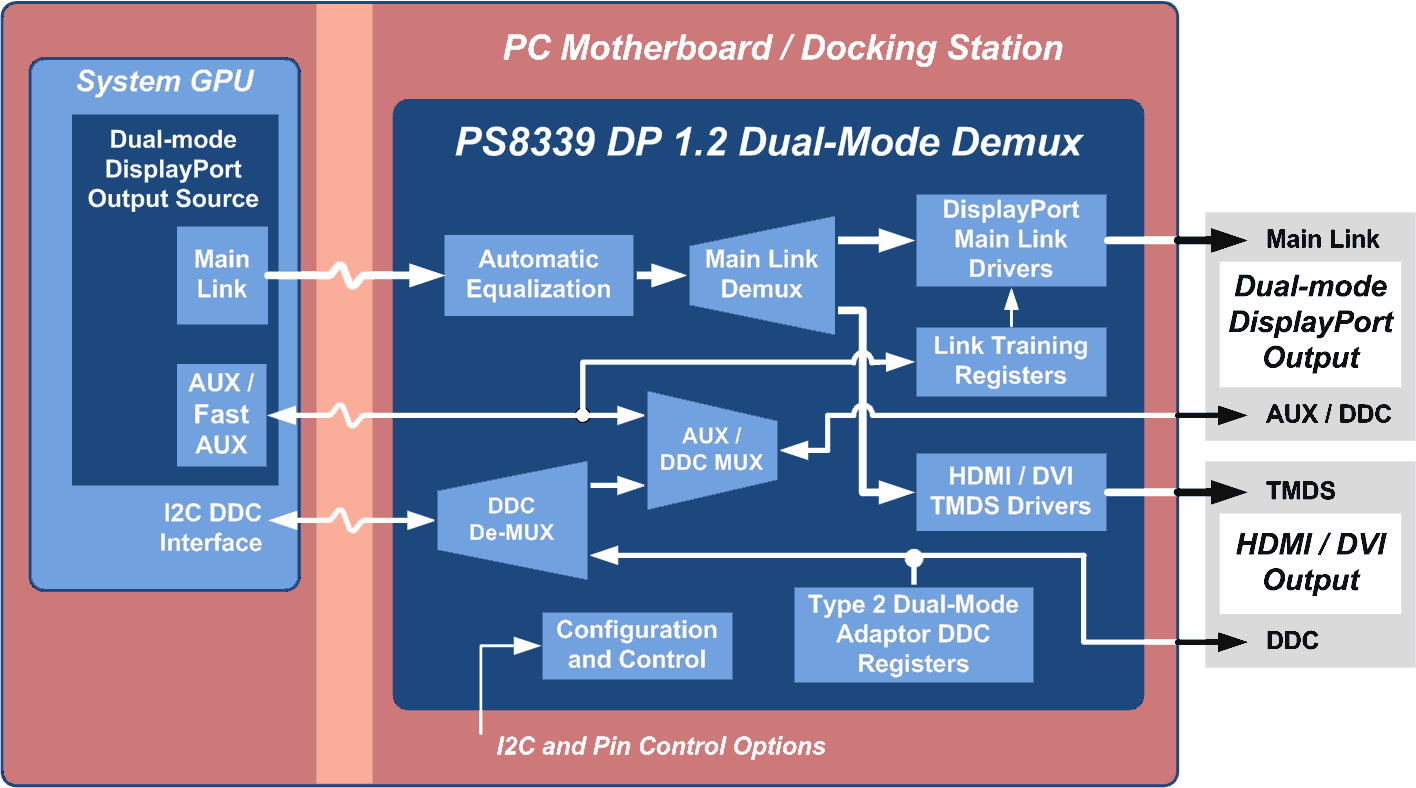 The PS8339 is a 1:2 demultiplexer IC that is connected to the output of a Dual-mode DisplayPort Source device. It outputs either a repeated Dual-mode DisplayPort signal from its DisplayPort output, or an HDMI or DVI signal from it’s TMDS output. Supports the higher data rates of DisplayPort 1.2: Link Rates of 5.4Gb/s (HBR2), 2.7Gb/s (HBR), and 1.62Gb/s (RBR) AUX Channel rate of 720 Mb/s (Fast AUX) and 1 Mb/s (Standard AUX) Supports up to 300MHz TMDS clock rate for the TMDS DVI/HDMI output Supports DVI, and HDMI 1.4b (1080P 3D @60Hz, or 4Kx2K @24 or 30Hz) TMDS data rate of up to 3.0Gb/s (with TMDS clock rate of up to 300MHz) Includes the Type 2 Dual-mode DisplayPort cable adaptor register to simply Source device driver support When passing the Dual-mode DisplayPort signal from the device’s input to the DisplayPort output, the PS8339 behaves as a DisplayPort repeater/redriver device. When the Source device is in TMDS mode, the AC coupled TMDS signal is converted to a DVI or HDMI compliant signal out the output through the use of an internal level-shifter. The buffered DDC path through the device is connected to an internal I2C register that is configured as a Type 2 Dual-mode DisplayPort cable adaptor register, as per the VESA® DisplayPort Dual-Mode Standard. This allows the Dual-mode Source device driver to recognize the 300MHz capability of the level shifter function. The Dual-mode DisplayPort output will also support an external level shifter-based DisplayPort-to-HDMI/DVI Dual-mode video adaptor (dongle). The PS8339 can be configured to use the output hot-plug detect pins to enable automatic mode switching and device power management. An automatic output squelch function disables the outputs when no input signal is present. The PS8339 can be used on the same circuit assembly as the Dual-mode DisplayPort Source device, or remotely such as in a notebook docking station. To ensure the maintenance of optimal signal integrity, the device includes an automatic equalizer on the input to compensate for PC board, connector and cable losses. When using the DisplayPort output, the PS8339 repeater / redriver function uses AUX channel interception, or “AUX snooping”, that enables it to respond to cable drive requirements indicated by the sink device during link training. This helps to ensure DisplayPort PHY compliance at the system output receptacle as well as to ensure robust interoperability with the display device, regardless of display cable length. APPLICATIONS PC Desktop and Notebook Motherboards Notebook Docking Stations Graphics Cards KEY FEATURES Supports Dual-mode DisplayPort™ (DP) De-multiplexing to a Dual-mode DisplayPort output and a TMDS™ output Full HDMI or DVI interface support from the TMDS output Compliant to the VESA DisplayPort 1.2 Standard — supports up to 5.4Gb/s link rate (HBR2), and AUX or Fast AUX Compliant to the HDMI 1.4b specification — supports up to 3.0Gb/s TMDS output Includes Type 2 Dual-mode adaptor register for Source driver discovery Built-in AUX CH and DDC combiner for Dual-Mode Source support DisplayPort repeater / redriver function included for the DisplayPort output, full link training for 1, 2 or 4 lanes (all 4 output amplitude levels and 4 pre-emphasis levels) Supports transmitter Feed Forward Equalizer (FFE) with Post Cursor 2 on HBR2 Dual-mode DisplayPort operation supported by DisplayPort output Automatic receiver equalization compensates for signal loss between Source device and PS8339 Automatic power management and output selection settings Low power consumption Source initiated power saving management Device configuration can be through pin settings or I2C slave input, which offers additional device options ESD performance 8kV Human Body Model (HBM) 7x7mm 56-pin QFN package 0 to 85°C operation DEVICE OPTIONS — Dual Supply or Single Supply PS8339A — Dual supplies, 1.5V & 3.3V PS8339B — Single 3.3V SupplyDual-Mode DisplayPort™ Source Demultiplexer with DisplayPort and TMDS Outputs, DP v1.2 and HDMI™ 1.4 capable